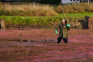 (251018) -- RICHMOND, 18 octubre, 2025 (Xinhua) -- Imagen del 17 de octubre de 2025 de un trabajador vadeando entre...