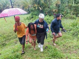 (251019) -- PROVINCIA DE QUEZON, 19 octubre, 2025 (Xinhua) -- Una residente recibe ayuda de las autoridades locales después de...