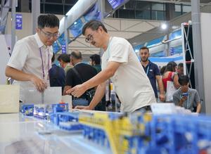 (251019) -- GUANGZHOU, 19 octubre, 2025 (Xinhua) -- Imagen del 16 de octubre de 2025 de un expositor (c) presentando...