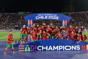 (251020) -- SANTIAGO, 20 octubre, 2025 (Xinhua) -- Imagen del 19 de octubre de 2025 del equipo de Marruecos festejando durante la ceremonia de premiación al término del partido final entre Argentina y Marruecos de la Copa Mundial Sub-20 de la FIFA Chile 2025, en Santiago, Chile. (Xinhua/Meng Dingbo) (oa) (ah) (ce)