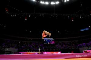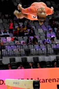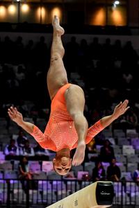(251021) -- YAKARTA, 21 octubre, 2025 (Xinhua) -- Flavia Saraiva, de Brasil, compite durante la clasificación femenina de Ejercicios de...