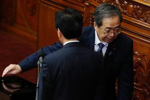 (251021) -- TOKIO, 21 octubre, 2025 (Xinhua) -- El líder del partido Komeito de Japón, Tetsuo Saito (d), vota durante...