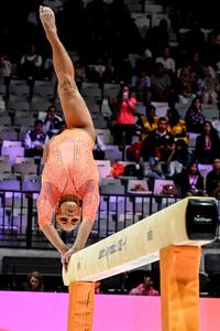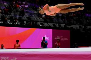 (251021) -- YAKARTA, 21 octubre, 2025 (Xinhua) -- Flavia Saraiva, de Brasil, compite durante la clasificación femenina de Ejercicios de...