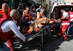 (251020) -- NAPLUSA, 20 octubre, 2025 (Xinhua) -- Imagen del 19 de octubre de 2025 de médicos vistos evacuando a...