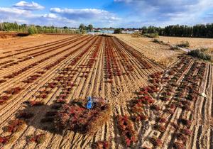 (251020) -- TONGLIAO, 20 octubre, 2025 (Xinhua) -- Imagen del 19 de octubre de 2025 de un aldeano secando chiles...