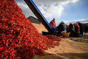 (251020) -- TONGLIAO, 20 octubre, 2025 (Xinhua) -- Imagen del 19 de octubre de 2025 de aldeanos ordenando chiles, en...