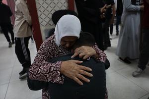 (251020) -- NAPLUSA, 20 octubre, 2025 (Xinhua) -- Imagen del 19 de octubre de 2025 de familiares lamentándose por un...