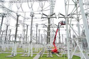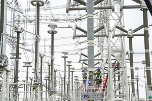 (251020) -- XUANCHENG, 20 octubre, 2025 (Xinhua) -- Empleados realizan trabajos de mantenimiento en la estación convertidora de Guquan, en...