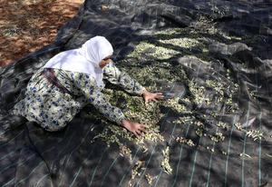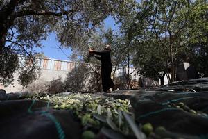 (251021) -- NAPLUSA, 21 octubre, 2025 (Xinhua) -- Una palestina recolecta aceitunas, en la aldea de Salem, cerca de la...