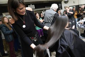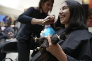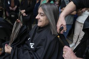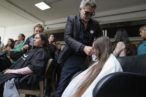 (251020) -- MONTEVIDEO, 20 octubre, 2025 (Xinhua) -- Una peluquera muestra el cabello de una mujer previo a cortarlo durante...