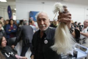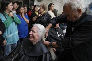 (251020) -- MONTEVIDEO, 20 octubre, 2025 (Xinhua) -- Un peluquero muestra el cabello de una mujer después de cortarlo durante...