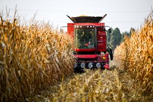 (251020) -- TONGLIAO, 20 octubre, 2025 (Xinhua) -- Imagen del 14 de octubre de 2025 de una segadora trabajando en...