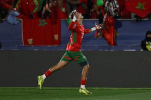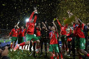 (251020) -- SANTIAGO, 20 octubre, 2025 (Xinhua) -- Imagen del 19 de octubre de 2025 del equipo de Marruecos festejando...