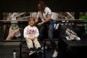(251020) -- BUENOS AIRES, 20 octubre, 2025 (Xinhua) -- Antonia Leroux (i), de 5 años, reacciona mientras una peluquera integrante...