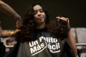 (251020) -- BUENOS AIRES, 20 octubre, 2025 (Xinhua) -- Morena, una mujer donante de cabello, observa su cabello cortado durante...