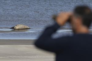 (251021) -- PIRIAPOLIS, 21 octubre, 2025 (Xinhua) -- Un hombre observa a una elefanta marina mientras amamanta a su cría...