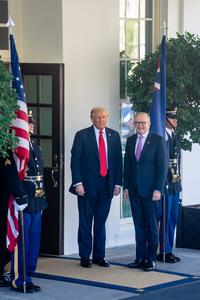 (251020) -- WASHINGTON, 20 octubre, 2025 (Xinhua) -- El presidente estadounidense, Donald Trump (2-i), da la bienvenida al primer ministro...