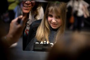 (251020) -- BUENOS AIRES, 20 octubre, 2025 (Xinhua) -- Antonia Leroux (d), de 5 años, observa su reflejo después de...