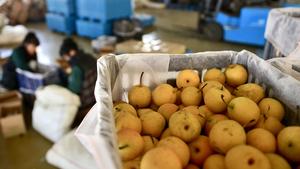 (251021) -- ANSHAN, 21 octubre, 2025 (Xinhua) -- Trabajadores clasifican peras Nanguo en una fábrica de vino de pera Nanguo,...