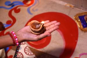 (251021) -- KARACHI, 21 octubre, 2025 (Xinhua) -- Una mujer sostiene una lámpara de aceite para celebrar el Diwali, o...