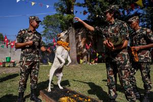 (251020) -- BHAKTAPUR, 20 octubre, 2025 (Xinhua) -- Un perro es venerado durante la celebración del festival Kukur Tihar en...