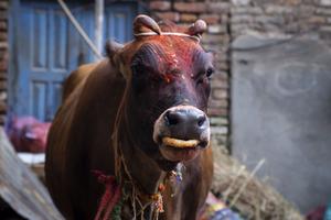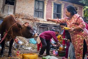 (251021) -- LALITPUR, 21 octubre, 2025 (Xinhua) -- Una vaca es adorada durante el Tihar, también conocido como el festival...