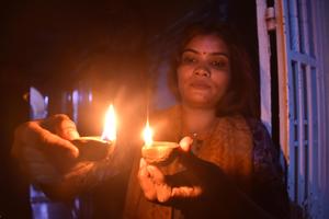 (251021) -- KARACHI, 21 octubre, 2025 (Xinhua) -- Una mujer enciende lámparas de aceite para celebrar el Diwali, o festival...