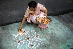 (251020) -- YANGON, 20 octubre, 2025 (Xinhua) -- Una mujer enciende lámparas de aceite para celebrar el Diwali, o festival...