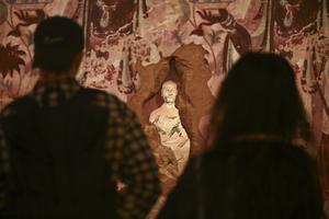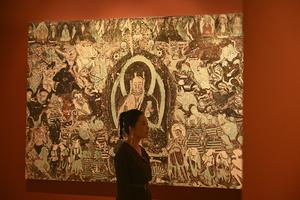 (251022) -- SHANGHAI, 22 octubre, 2025 (Xinhua) -- Una invitada toma fotografías de un mural de Dunhuang durante la vista...