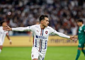 (251024) -- QUITO, 24 octubre, 2025 (Xinhua) -- Imagen del 23 de octubre del 2025 del jugador, Lisandro Alzugaray, de Liga Deportiva Universitaria de Quito, de Ecuador, festejando su anotación durante el partido de ida correspondiente a la semifinal de la Copa Conmebol Libertadores ante Palmeiras, de Brasil, celebrado en el estadio Rodrigo Paz Delgado, en Quito, capital de Ecuador. (Xinhua/Ricardo Landeta) (rl) (rtg) (ra) (ce)