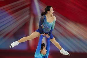 (251025) -- CHONGQING, 25 octubre, 2025 (Xinhua) -- Sui Wenjing (arriba)/Han Cong, de China, realizan una presentación durante el patinaje...