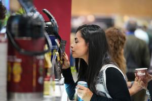 (251024) -- BOGOTA, 24 octubre, 2025 (Xinhua) -- Una mujer huele café durante la feria Cafés de Colombia Expo 2025...