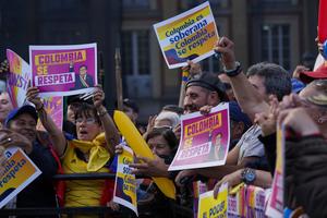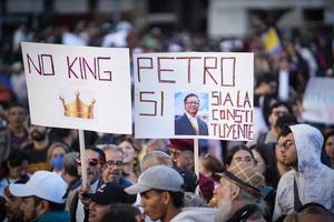(251024) -- BOGOTA, 24 octubre, 2025 (Xinhua) -- Personas sostienen pancartas en apoyo al presidente colombiano, Gustavo Petro, durante una...