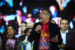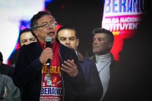 (251024) -- BOGOTA, 24 octubre, 2025 (Xinhua) -- El presidente colombiano, Gustavo Petro (frente), pronuncia un discurso durante una concentración...