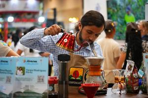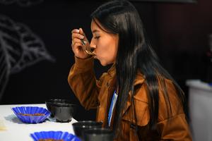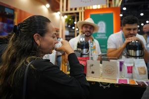 (251024) -- BOGOTA, 24 octubre, 2025 (Xinhua) -- Una mujer prueba café durante la feria Cafés de Colombia Expo 2025...