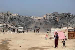 (251024) -- GAZA, 24 octubre, 2025 (Xinhua) -- Un niño palestino camina por una calle de edificios destruidos, en Jabalia,...