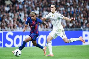 (251027) -- MADRID, 27 octubre, 2025 (Xinhua) -- Imagen del 26 de octubre de 2025 de Alvaro Carreras (d), de Real Madrid, disputando el balón con Lamine Yamal, de FC Barcelona, durante el partido de fútbol de LaLiga entre Real Madrid y FC Barcelona, en el Estadio Santiago Bernabéu, en Madrid, España. (Xinhua/Gustavo Valiente) (oa) (ah) (ce)