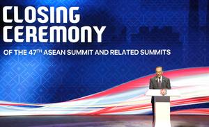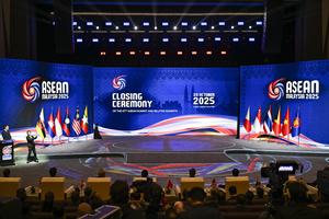 (251028) -- KUALA LUMPUR, 28 octubre, 2025 (Xinhua) -- Personas asisten a la ceremonia de clausura de la 47ª Cumbre...