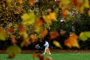 (251028) -- LONDRES, 28 octubre, 2025 (Xinhua) -- Imagen del 27 de octubre de 2025 de una mujer empujando una...
