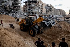 (251027) -- GAZA, 27 octubre, 2025 (Xinhua) -- Una excavadora egipcia trabaja en el área de al-Tuffah, en el este...