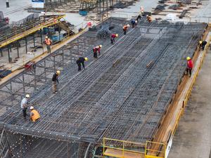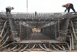 (251027) -- RUGAO, 27 octubre, 2025 (Xinhua) -- Trabajadores operan en el sitio de fabricación de vigas de la sección...