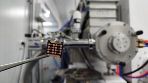 (251028) -- NANJING, 28 octubre, 2025 (Xinhua) -- Imagen del 25 de octubre de 2025 de una célula solar de perovskita, desarrollada por investigadores de la Universidad de Nanjing y otras instituciones, en Nanjing, en la provincia de Jiangsu, en el este de China. Un equipo de investigación conjunto en China ha desarrollado un nuevo método que, por primera vez, ha permitido que un tipo clave de célula solar avanzada de perovskita supere el umbral de eficiencia del 30 por ciento. (Xinhua) (oa) (ah) (ce)