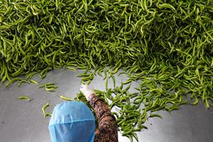(251029) -- GAO'AN, 29 octubre, 2025 (Xinhua) -- Una agricultora clasifica chiles en el centro de clasificación de un parque...