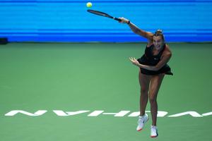(251010) -- WUHAN, 10 octubre, 2025 (Xinhua) -- Aryna Sabalenka sirve la pelota durante el partido de cuartos de final...