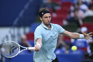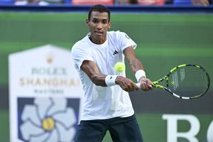 (251010) -- SHANGHAI, 10 octubre, 2025 (Xinhua) -- Felix Auger-Aliassime, de Canadá, devuelve la pelota a Arthur Rinderknech, de Francia,...