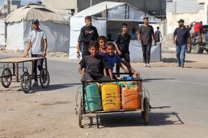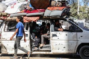 (251012) -- GAZA, 12 octubre, 2025 (Xinhua) -- Imagen del 11 de octubre de 2025 de palestinos cargando sus pertenencias...
