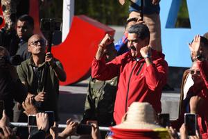 (251012) -- CARACAS, 12 octubre, 2025 (Xinhua) -- El presidente venezolano, Nicolás Maduro (c), reacciona durante una marcha en el...