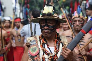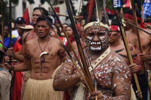 (251012) -- CARACAS, 12 octubre, 2025 (Xinhua) -- Un integrante de una etnia indígena de Venezuela participa en una marcha...