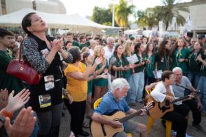 (251009) -- TEL AVIV, 9 octubre, 2025 (Xinhua) -- Israelíes festejan tras el anuncio de que Israel y Hamas han...