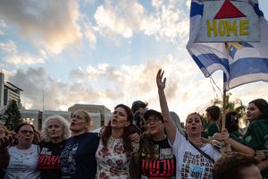 (251009) -- TEL AVIV, 9 octubre, 2025 (Xinhua) -- Familiares de los rehenes israelíes se abrazan tras el anuncio de...